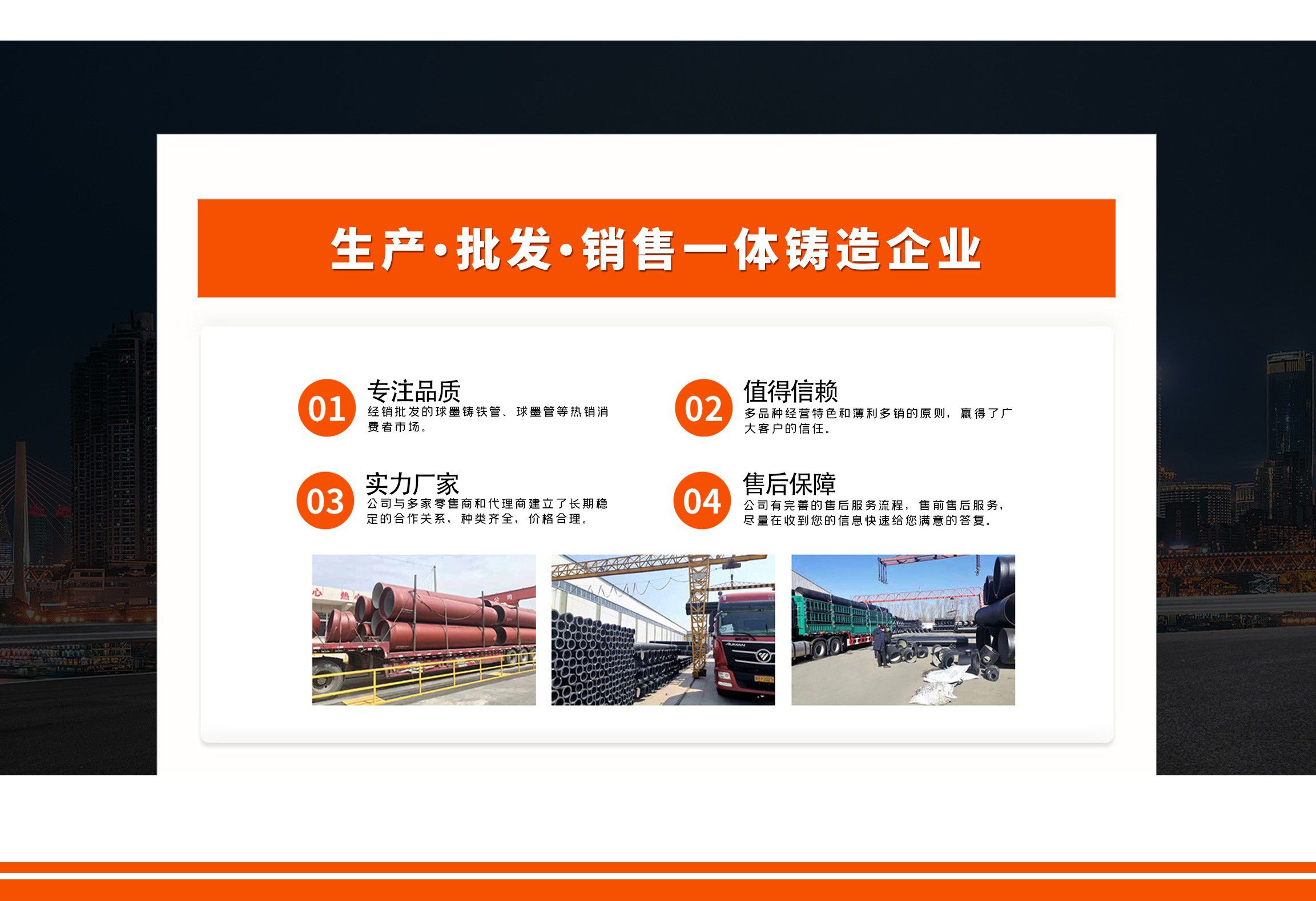 青島金源達(dá)管業(yè)有限公司主要經(jīng)營各種規(guī)格球墨鑄鐵管,球墨管,球墨鑄鐵管廠家等產(chǎn)品,質(zhì)量可靠,誠信經(jīng)營,值得信賴! 青島金源達(dá)管業(yè)有限公司始終堅(jiān)持“誠信立業(yè),追求卓越,合作共贏,共同發(fā)展”,竭誠歡迎各界朋友來廠參觀指導(dǎo),洽談業(yè)務(wù)。我們愿與您攜手共進(jìn),互惠雙贏,共創(chuàng)未來! 公司堅(jiān)持“以奮斗者為本”的理念,關(guān)心關(guān)愛職工,職工的獲得感、幸福感更加充實(shí)、更有保障、更可持續(xù);秉承“忠誠企業(yè)、勇于擔(dān)當(dāng)、開拓創(chuàng)新、主動(dòng)作為”,堅(jiān)持黨建領(lǐng)航、創(chuàng)新驅(qū)動(dòng)、文化塑魂、奉獻(xiàn)社會(huì),全面致力于綠色、低碳、高效、高質(zhì)量發(fā)展?! ≡概c各界朋友攜手并進(jìn),共創(chuàng)未來!...